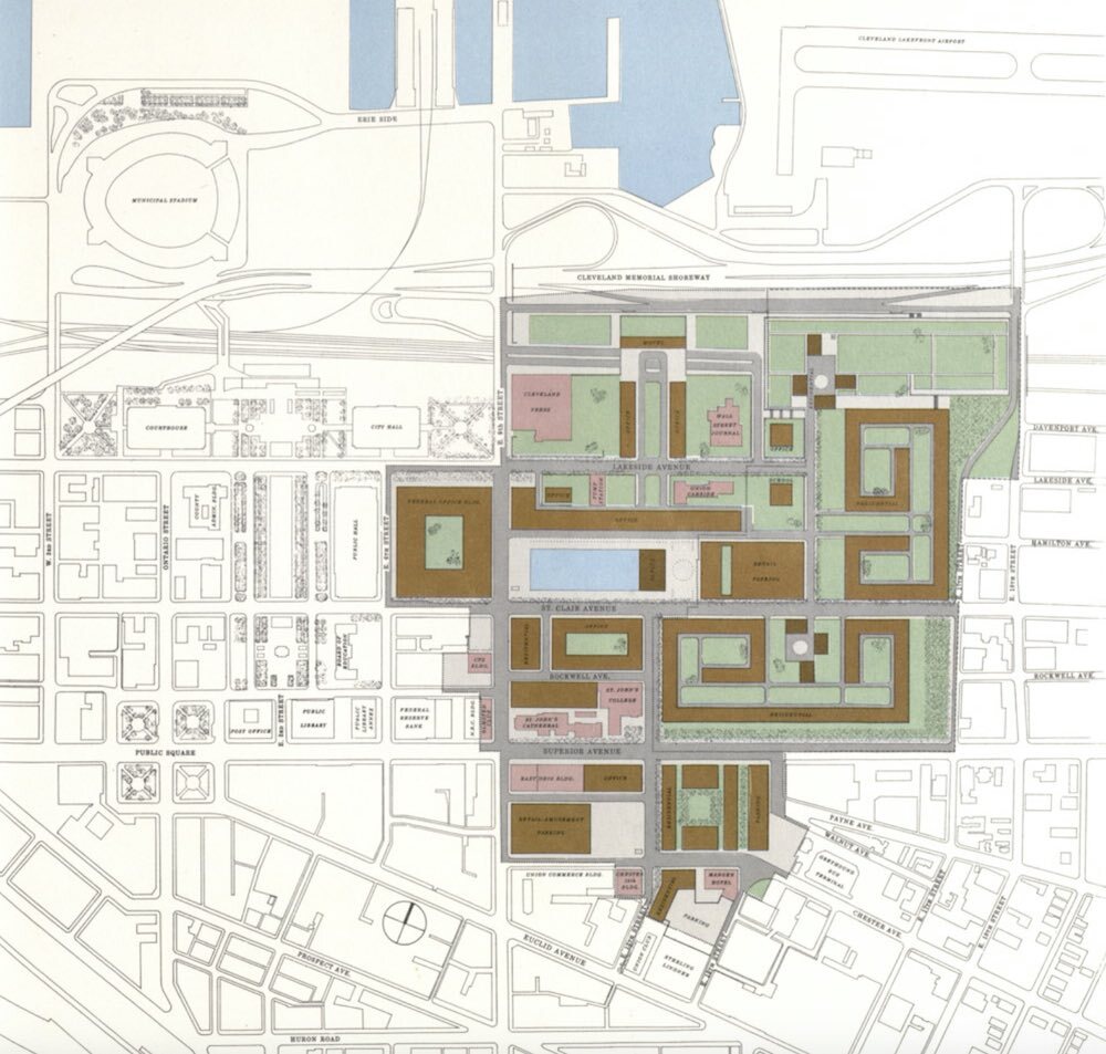 Undeterred, the trio bypassed the Cleveland Planning Commission and went straight to Mayor Anthony Celebrezze, who saw in their idea a project he could sell. Unveiled in January 1960, the plan, christened Erieview, promised the nation's largest downtown urban renewal project, a reflection of city leaders' desire to make up for lost time. They pronounced the 125-acre renewal area (roughly bounded by the Memorial Shoreway, East 9th Street, Chester Avenue, and East 17th Street) “blighted,” sealing the fate of many small businesses and manufacturers and some single-room-occupancy hotels. The city commissioned prominent modernist architect I. M. Pei to design the Erieview plan, which looked like many other plans of its era – a Tetris board of low-slung, interlocking buildings wrapping around open plazas punctuated by taller towers. The tallest of them was plotted between East 9th and 12th Streets with an open plaza and reflecting pool. It was not the first time Cleveland saw a grand scheme to reorient its downtown toward the lakefront. Pei’s conception reprised, updated, and extended eastward the early 20th-century Group Plan designed by the “City Beautiful” architect Daniel Burnham of Chicago.