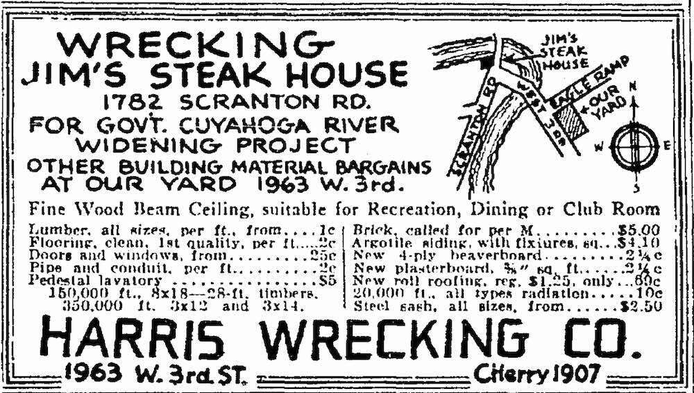 Pedestal Lavatory, $5.00 In this 1940 newspaper ad, Harris Wrecking Company offered pieces of the old Jim’s Steak House at bargain prices. Source: Cleveland Plain Dealer Date: September 8, 1940