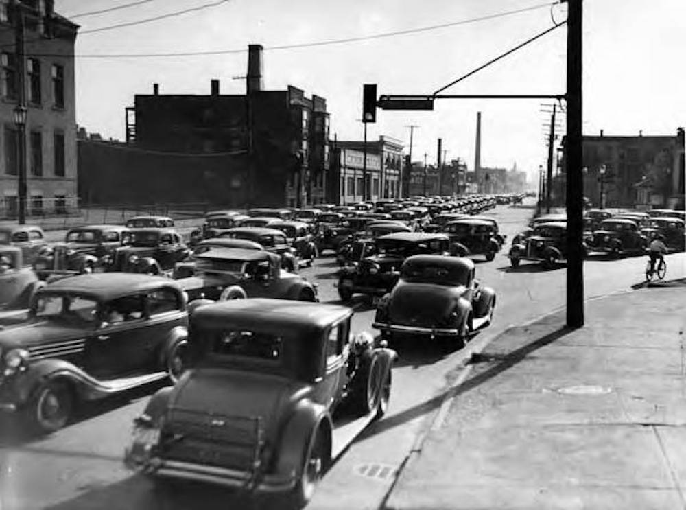 As noted above, the 1920s witnessed a dramatic transformation of Carnegie Avenue into a commercial corridor. In the next three decades, businesses continued to locate on the southern thoroughfare, further reducing the number of houses, and residents, on the Avenue. The 1930s witnessed the completion of the construction of the 12-story Gothic Revival style Cleveland Club (later the Tudor Arms Hotel) at 10600 Carnegie, as well as that of the eight-story art deco style Carnegie Medical Building at 10515 Carnegie. The 1940s saw, among other new arrivals, Central Cadillac, and the 1950s, Pratt-Webb Bakery, Reynold Machinery Co., and the General Electric X-Ray Department. The 1950s also saw the new Innerbelt Freeway cut a swath through Carnegie Avenue between East 22nd and East 28th Streets, resulting in the removal of seven houses and reducing the number of houses still standing on Carnegie Avenue to less than thirty. During these three decades, Carnegie Avenue became the busiest street in Cleveland, especially during evening rush hour, with tens of thousands of vehicles traversing it daily. It also became a motorist’s nightmare with its narrow traffic lanes, plentiful chuckholes, and distracting billboard signs. Some Clevelanders began to refer to it as “Billboard Alley,” others as “Agony Alley.” In the 1940s, Cleveland Safety Director Elliot Ness installed a new signalization system and prohibited left turns off Carnegie Avenue during rush hour, but neither solved the congestion problem. In 1953, the City began an “experiment,” making Carnegie one-way, eastbound only, during evening rush hour. The experiment worked and, for the next 50 years, motorists, during evening rush hour, could only travel east on Carnegie from Prospect Road (a diagonal roadway at East 46th Street constructed in 1931 to relieve traffic on Prospect Avenue). That half century long restriction was modified in 2003 to also permit traffic to travel westward on Carnegie during evening rush hour.