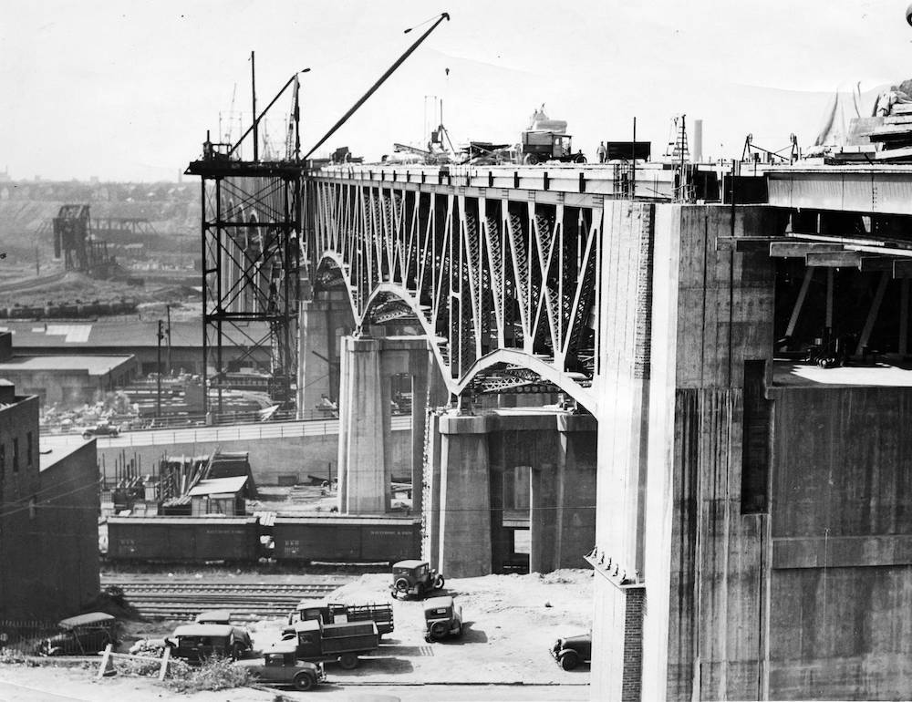 By 1917, the City’s street funding problems had been sufficiently resolved to allow it to begin acquiring land for the first extension of the southern thoroughfare--from the eastern terminus of Carnegie Avenue at East 89th Street to East 100th Street. Over the course of the next two years, land was acquired and cleared, new roadway was built and paved, and, in 1919, the extension was opened to the public. The successful construction of this first extension was not without neighborhood cost. A total of 13 single family homes on cross streets were either moved or razed in the process. In addition to those houses, Hart Hall, a four-story, eight-suite apartment building on East 93rd Street, also in the way, was moved (with its tenants still in it) to a new site on Carnegie Avenue near East 89th Street, where it later became an annex to the Bolton Square Hotel. Four years after the first extension was completed, a second from East 100th Street to East 107th Street was constructed, which removed another dozen or so houses that stood in the way. This second extension connected Carnegie Avenue to Fairchild Road, the latter road soon being renamed Carnegie Avenue from East 107th Street to Stearns Road. While Carnegie Avenue’s eastward extensions to the city’s east end were thus completed by 1923, necessary westward extensions to connect the southern thoroughfare to downtown, as well as to the west side by a proposed new high level bridge at Lorain Avenue, stalled for nearly another decade as city officials deliberated both where to locate the eastern terminus of the new bridge and how best to connect the southern thoroughfare to it. While these deliberations were continuing, the City, in 1924-1925, widened Carnegie Avenue from East 22nd to East 55th to accommodate more automobile traffic and to better align it with the roadway east of East 55th Street. In 1930, after it had determined that the location of the eastern terminus of the new bridge should be at Central Avenue near Ontario Street, the City constructed a westward extension of the southern thoroughfare from East 22nd Street in 1930-31. At East 21st Street, the extension was angled in a southwest direction in order to connect it to Central Avenue at East 14th Street. Central Avenue from East 14th Street to the new Lorain-Carnegie Bridge, which was completed and opened In 1932, was then renamed Carnegie Avenue.