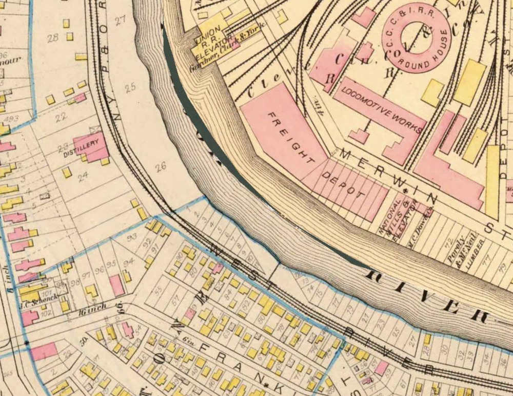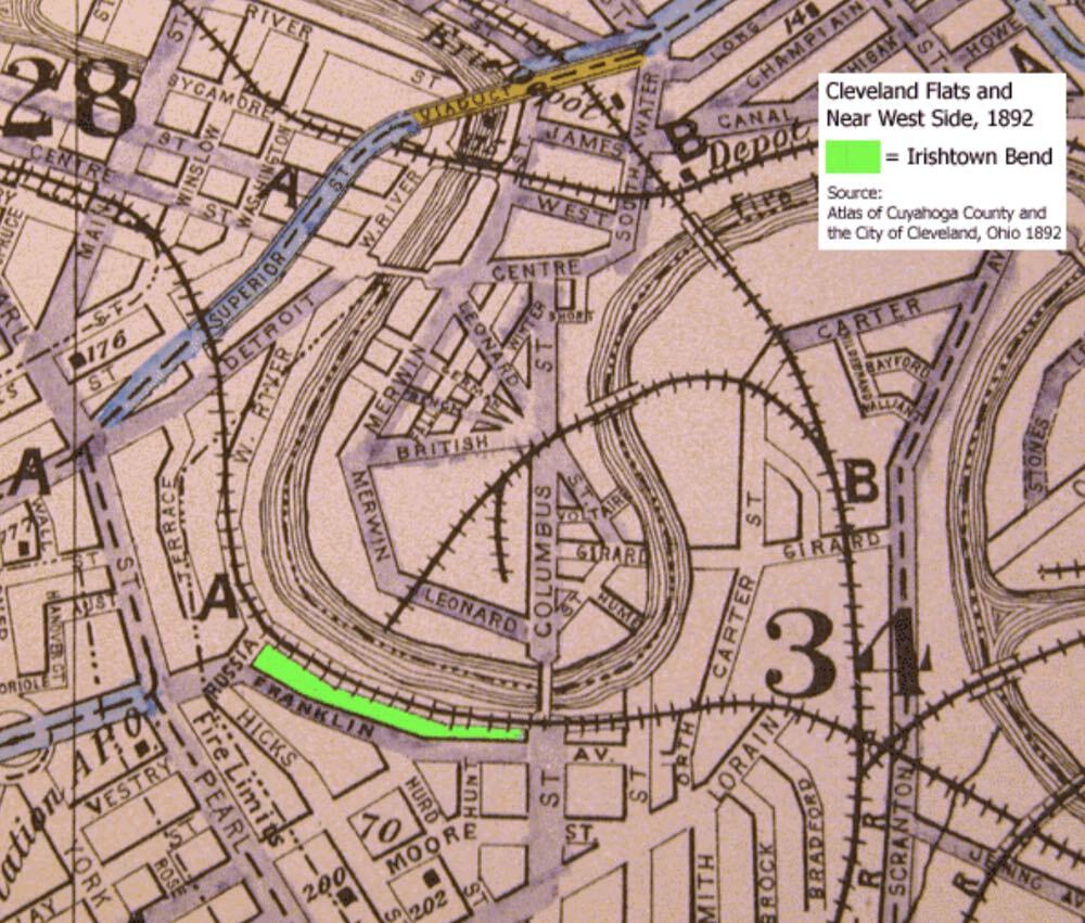 Irishtown Bend was a place marred by several stigmas attached to it. One of these stigmas was due to the area’s poor and hazardous living conditions. Prior to the 1860s, Irishtown Bend was a shantytown filled with one-room shacks, most of which were poorly built. The whole family would oftentimes live in these one-room shacks. They were a huge fire hazard and in 1877 the Cleveland Plain Dealer had a story about a fire that started with a stove being knocked over, spread quickly, and burned down five shanties. The Bend was unsanitary because there were many factories located by the river. At this time, there were no regulations in place for proper waste management, making it all too easy for factories to dump waste and sewage into the river. These conditions caused the whole area to be known as the “open sewer of the city.”
