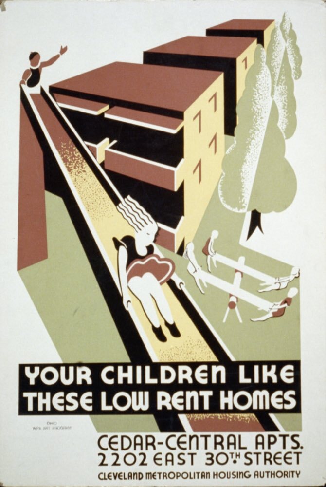 WPA poster for Cedar-Central Apartments The Works Progress Administration made posters to promote public housing in the 1930s. The goal was to normalize using public housing and encourage people to apply for the apartments by advertising them as family friendly and comfortable. The Cedar-Central Apartments, like many early housing projects, borrowed the garden-apartment style popularized by leading modernist architects of the day. Source: Library of Congress Creator: Works Progress Administration Date: ca. 1940