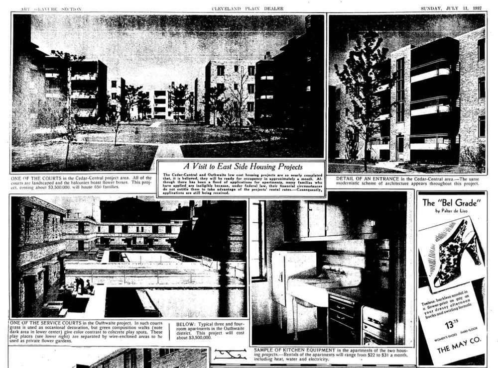 Newspaper Coverage of New Projects Cleveland’s Plain Dealer had a page expose of the Cedar-Central Apartments upon the complex’s completion in 1937. The newspaper took a look into the architecture, the utilities offered, and future public housing plans for the city. As the first public housing project, there were many questions that the public had about the complex, and it was a point of public interest and discussion. Source: Cleveland Plain Dealer Date: July 11, 1937