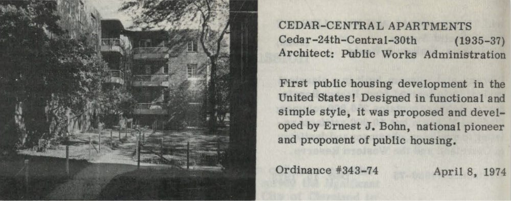 Cleveland Landmarks Commission Report of the First 46 Landmarks The guide to Cleveland’s Historic Landmarks which was published in 1975 includes ordinance #343-74, the Cedar-Central Apartments. A simple write-up underplays the importance Cleveland made in public housing in the United States. This modest write-up of the Cedar-Central Apartments is a part of a book of more well-known Cleveland Landmarks. Its inclusion shows shows the historic importance of public housing in the community. Creator: Cleveland Landmarks Commission Date: April 8, 1974