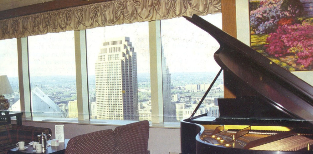 But in Cleveland the top story was Top of the Town, which opened in 1964 on the 38th floor of the recently completed Erieview Tower. Like the other “Tops” the view from its multiple dining rooms was amazing, the food decent and the atmosphere convivial. Glass and silverware clinked. Stouffer Girls and tuxedoed waiters hovered. A series of “mirror murals” depicting iconic Cleveland structures graced the walls. Musicians played to the dine-in crowd and to all of Northeast Ohio via WJW radio.