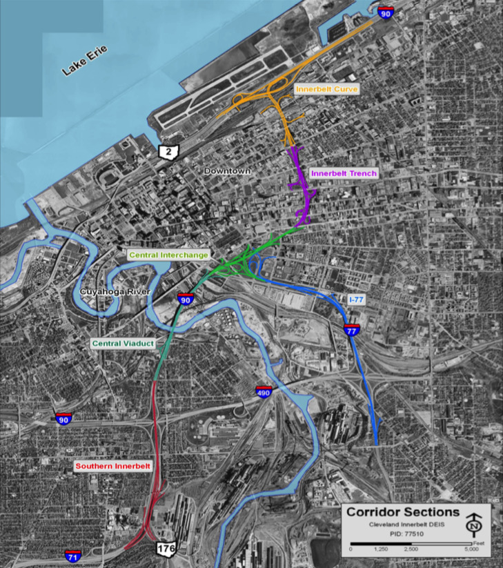Sixty years later, Inner Belt interchanges with intersecting interstate highways have been in service while other improvements remain in progress. The westbound Memorial Shoreway, including the Inner Belt, continues west at West 25th street and is known as Interstate 90 crossing the northern tier of the nation. The northbound Airport/Medina Freeway is now the northern end of Interstate 71, ending where it intercepts I-90. A recent adjacent connection also sends traffic due south to Parma on Route 176 (Jennings Freeway). To the east, the north/south Willow Freeway is now Interstate 77, terminating at the Central Interchange with I-90. The Central Viaduct (Inner Belt Bridge) was evaluated for replacement in 2008. Two bridges were designed to replace the structure with added lane capacity and staged construction commenced in 2011. In 2016 the final phase of the eastbound George V. Voinovich Bridge completed the $287 million dollar project doubling its capacity. Work continues on Interstate 490 to connect east and west neighborhoods from the Inner Belt across the industrial flats via the new Opportunity Corridor eastward to the Cleveland Clinic and University Circle. The spiderweb growth of the 1956 downtown highway plan has supported millions of vehicles passing into, through, and out of the central urban area to carry Cleveland’s notably efficient auto traffic and supporting the city’s commercial and industrial economy.