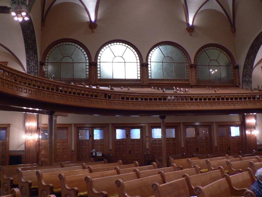 Interior of Pilgrim Church The church's curved galleries could be partitioned into educational spaces, a hallmark of the "Akron Plan" design that was very popular in church design more than a century ago, especially in the Great Lakes region. Source: Flickr, CC BY-SA Creator: Stu Spivack