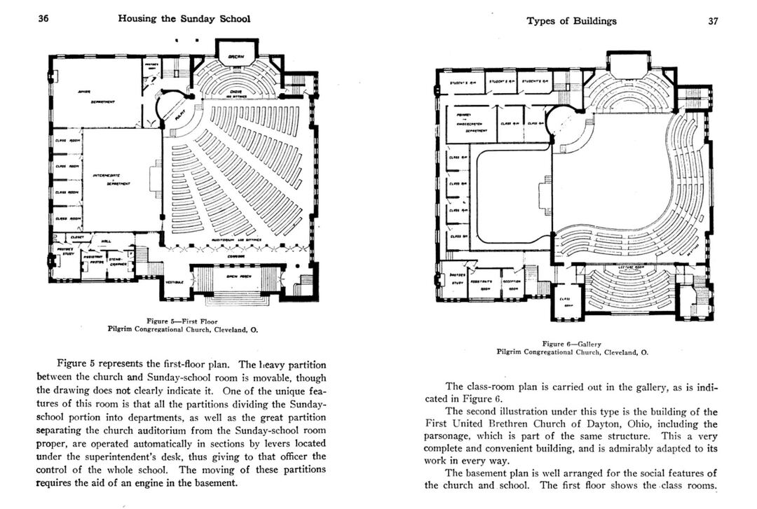 Pilgrim Church's Akron Plan These floor plans of the first and second floors show the compartmentalization of space by use of movable partitions powered by an engine located in the church's basement. Source: Lawrance, Marion. Housing the Sunday School: Or, A Practical Study of Sunday School Buildings. Boston and Chicago: Pilgrim Press, 1911. 36-37.