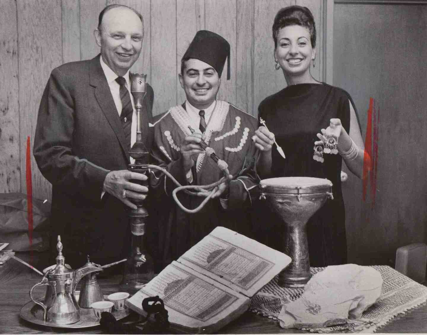 Items Donated to Heritage Room, 1965 An ancient Koran and other historical items are presented to Edward Esber (center) of St. George Antiochian Church by Mr. and Mrs. Roy Frankhauser for use in the Heritage Room in the educational and cultural center adjoining the church. Source: Cleveland Memory, Cleveland State University Library Special Collections Date: 1965