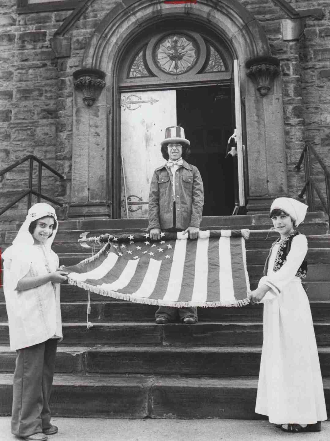 Honoring the Flag, 1976 Youngsters — two of whom are dressed in traditional Arab attire — stand on the steps of St. George Antiochian Church with an American flag. Source: Cleveland State University Library Special Collections
