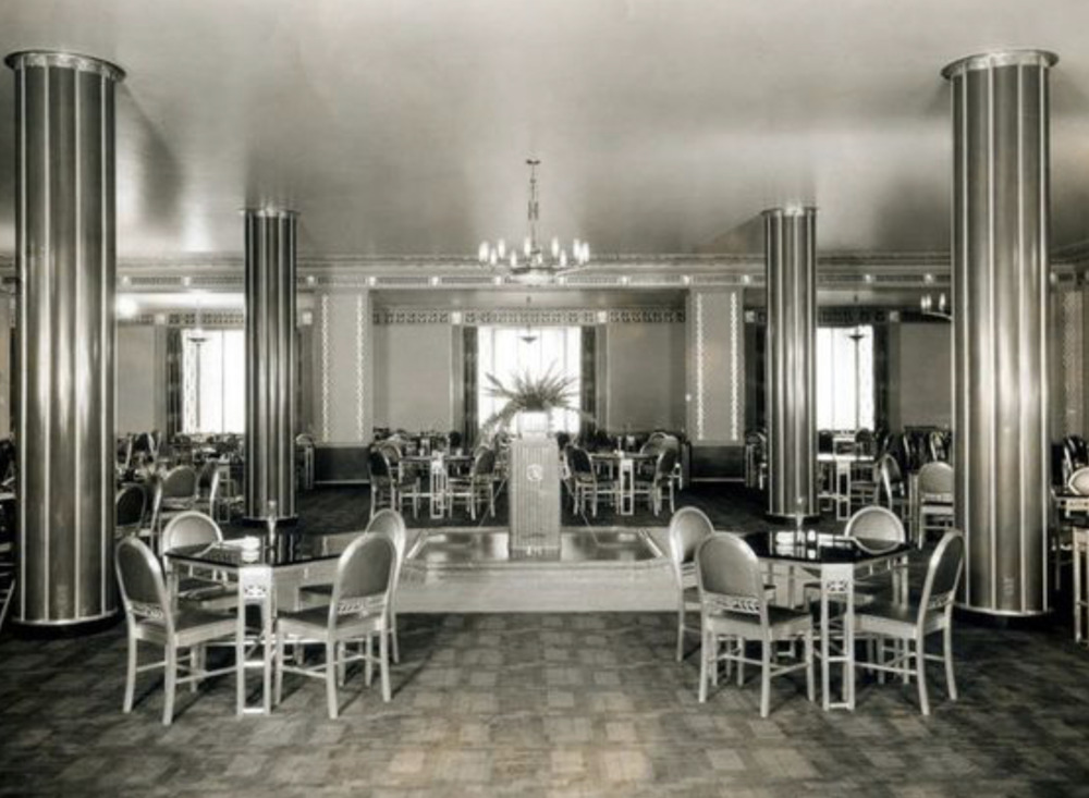 One contributor to the eatery’s special-event status was its décor: an immersive Art Deco experience. Short for Arts Décoratifs, Art Deco was the height of fashion when Higbee’s opened in 1931. And a meal at the Silver Grille was a celebration of everything Art Deco stood for: luxury, glamour, hope and the power of progress. Entering the restaurant, guests were met by a red marble fountain stocked with goldfish. Ornate grillwork complemented the green-colored walls, bronze light fixtures and floor-to-ceiling columns bathed in purple light. Uber-modern aluminum tables with black marble tops dotted the room. Even the name of the restaurant’s manager sounded innovative: Mrs. Kenneth McKay (yes, Kenneth was her first name) previously taught restaurant management at Columbia University. The space was conceived by Rorimer-Brooks Studios in collaboration with Philip Lindsley Small, who designed Shaker Square and nearby Moreland Courts. Small also architected numerous structures for John Carroll and Case Western Reserve Universities, as well as opulent homes in Cleveland Heights and Shaker Heights.
