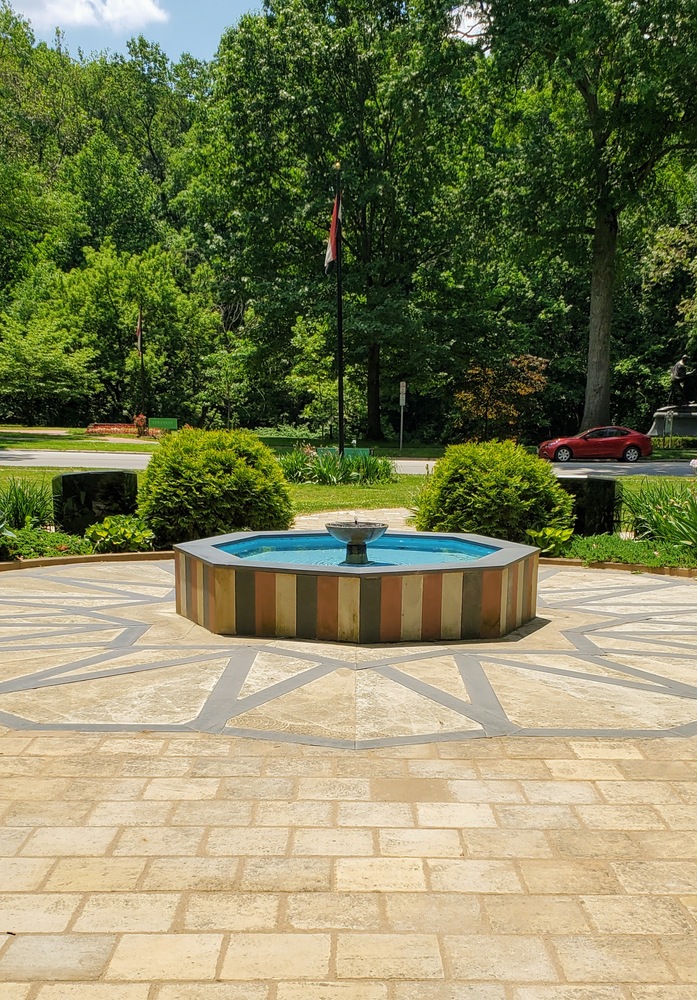 Entering the garden from East Boulevard, you will pass through Syrian-style arches. These arches were designed to replicate the Arch of Triumph in Palmyra, Syria. Now destroyed, the original arches in Palmyra were built in the late second century into the early third century. Once through the arches, it descends into a Roman-style amphitheater, designed to mimic the ancient amphitheater of Bosra. In the middle of the amphitheater sits an Arabic-style fountain, constructed with traditional Syrian stone colors. The fountain is surrounded by a sixteen-point star design that is a common design in Arabic architecture. Surrounding the amphitheater are six black granite columns or pedestals that detail Syrian history from antiquity to the present. These include achievements like the first alphabet, a history of Syrian immigration in the United States, and the poem “A Message to Young Americans of Syrian Origin” by Khalil Gibran, written in 1919.