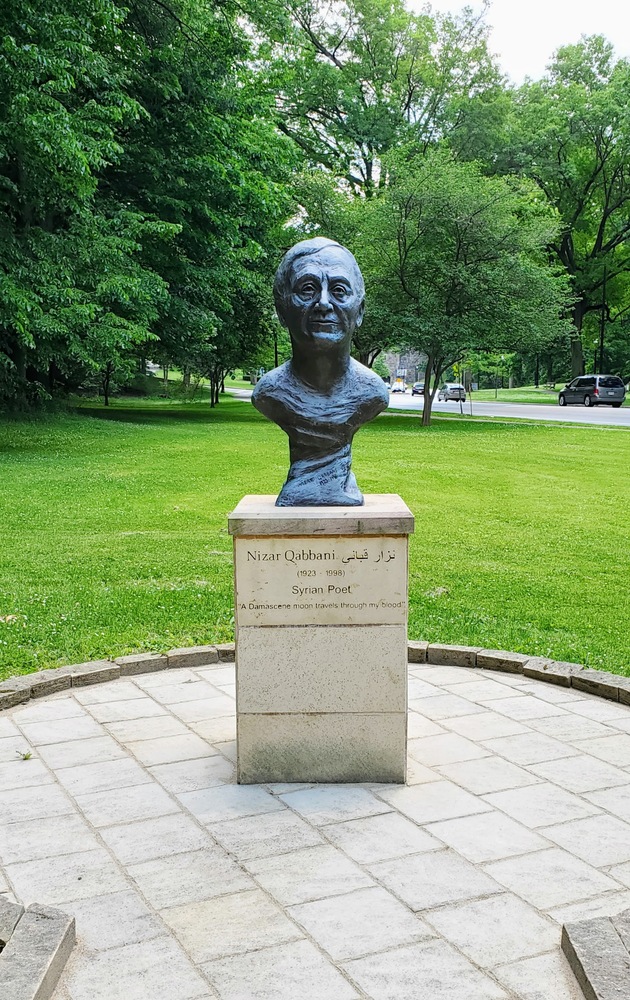The most recent addition to the garden is the bust of Nizar Qabbani. Nizar Qabbani (1923-1998) was a Syrian poet during the mid-to-late twentieth century who tackled themes of romance and politics throughout his work. Formally dedicated to the garden on September 12, 2015, the bust was created by local Syrian American artist Leila Khoury. In addition to the many architectural features, the garden is landscaped with Damascene roses and cedars of Lebanon. These design elements contribute to a beautifully unique scene that captures many elements of Syrian cultural heritage.