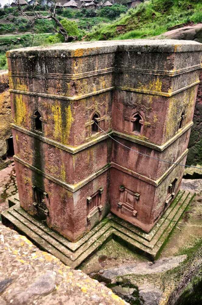 The churches of Lalibela were constructed in the 12th century and attributed to the King Lalibela who wanted to create a “New Jerusalem” in Ethiopia due to Islamic control of the Holy Land. He hoped they would serve as an alternative pilgrimage site while the fighting continued between Christians and Muslims. There are eleven churches, each is carved out of a single block of stone. Each church is different from the next but many share design aspects. The replica doorway chosen for the Ethiopian cultural garden is one of these aspects.