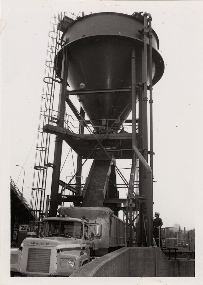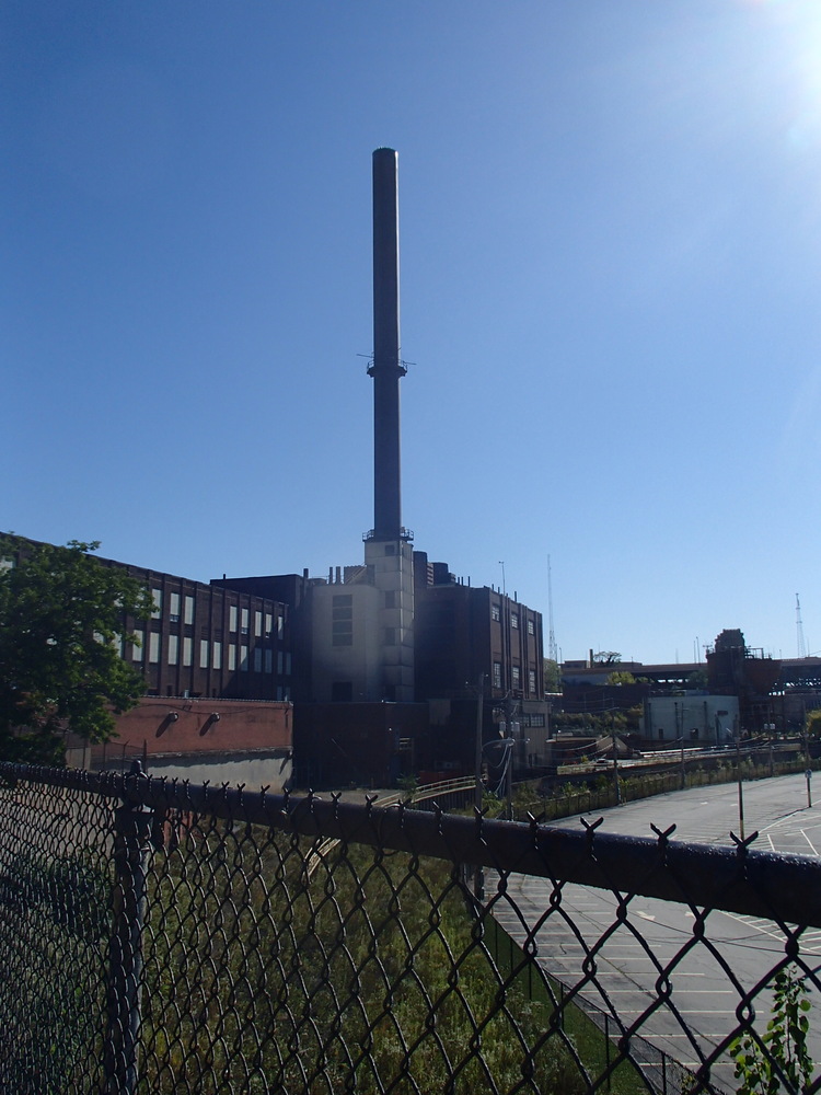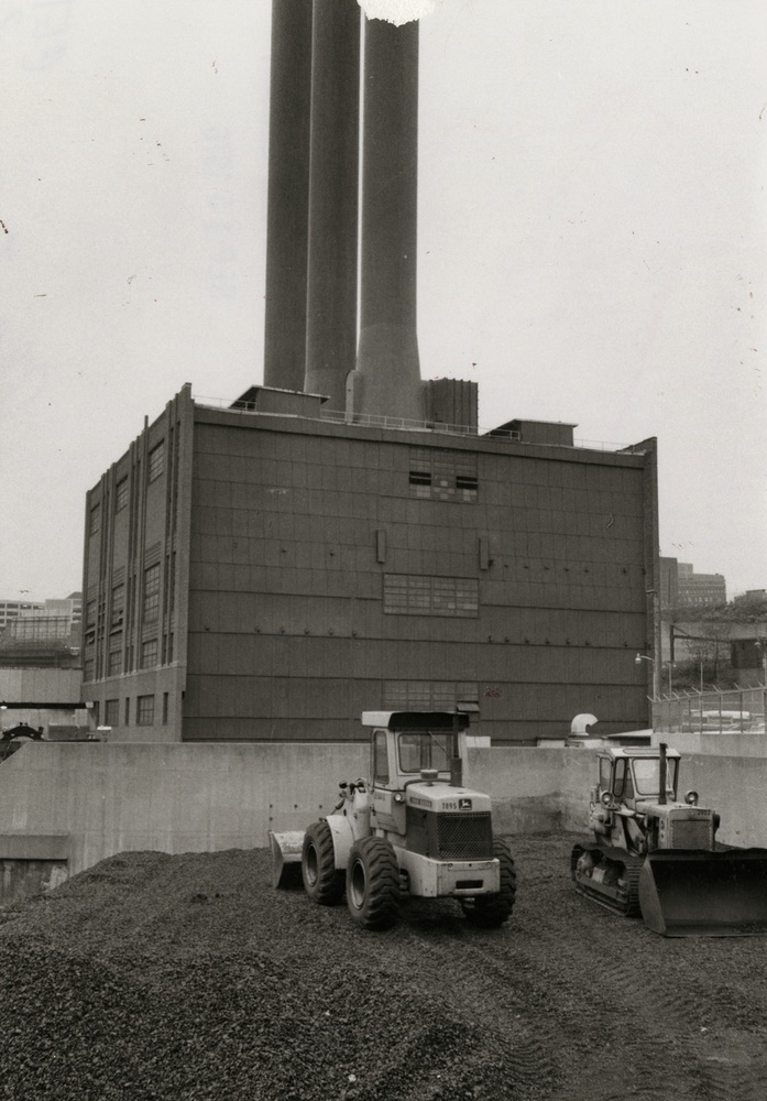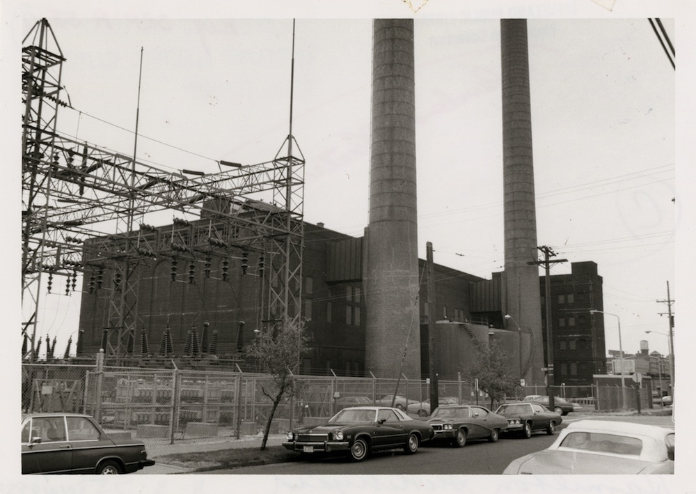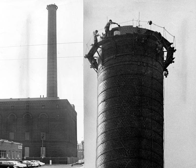 A new generation plant was built at East 20th Street and Hamilton Avenue in 1924 to complement Canal Road production of both electricity and steam. The Canal Road plant was re-engineered, demolished, and rebuilt in 1928. Over the next twenty years CEI expanded its steam business to serve more than 660 customers bounded by Prospect Avenue north to Lake Erie and the Cuyahoga River east to East 24th Street. CEI continued to be recognized as a leader in the district heating technology and business, setting a national example. In 1946, the Canal Road plant ceased electric power production and turned to steam only. Two years later, CEI constructed three 235-foot colossal smokestacks at the Canal Road plant to provide greater draft for new boilers at the plant. The stacks were 12 feet inside diameter and 13 feet outside diameter steel and brick construction. During construction, workers ascended and descended the inside of the stacks while standing on a crane ball. The three tall stacks replaced ten smaller stacks and became a ‘landmark’ sight along Ontario Avenue visible from Public Square looking south. Only one remains today.