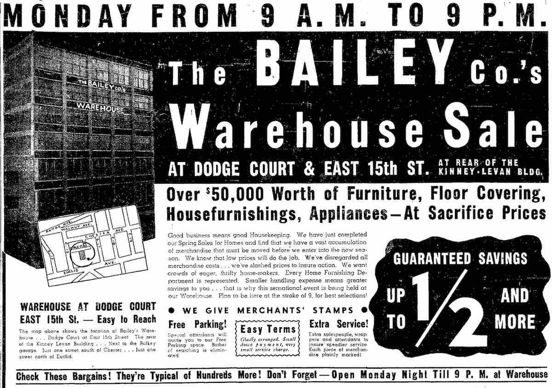 Bailey Co.'s Warehouse Bailey Co., a Cleveland department store on Ontario Street, leased the back half of the former Kinney & Levan Building on Dodge Court for its warehouse in 1937. Source: Cleveland Plain Dealer Date: May 19, 1940