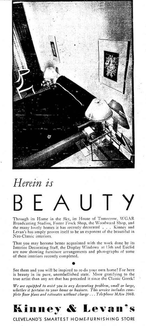 Kinney & Levan's Interiors This ad points to how the company was active in interior decorating services in the 1930s, including furnishing the model "Home in the Sky" and "House of Tomorrow" at the Builders' Exchange Building. Like those models (which were the HGTV of their time), its store was set up to inspire customers to "re-do your own home!" Source: Cleveland Plain Dealer Date: April 29, 1934