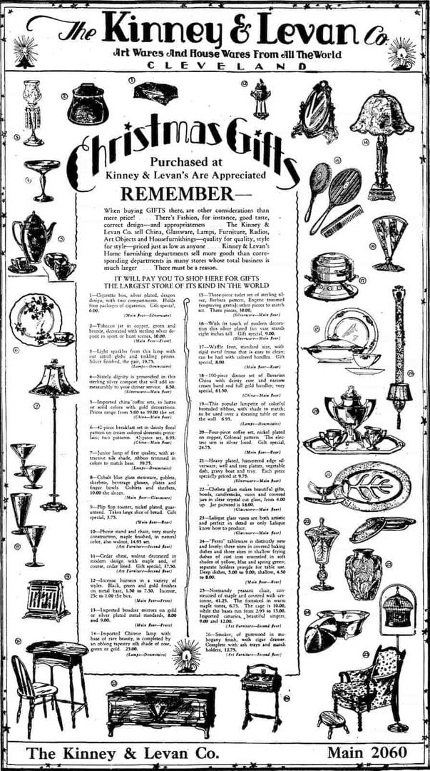 Christmas Advertisement This ad shows the wide of range of items sold at Kinney & Levan in the late 1920s. Source: Cleveland Plain Dealer Date: December 16, 1928