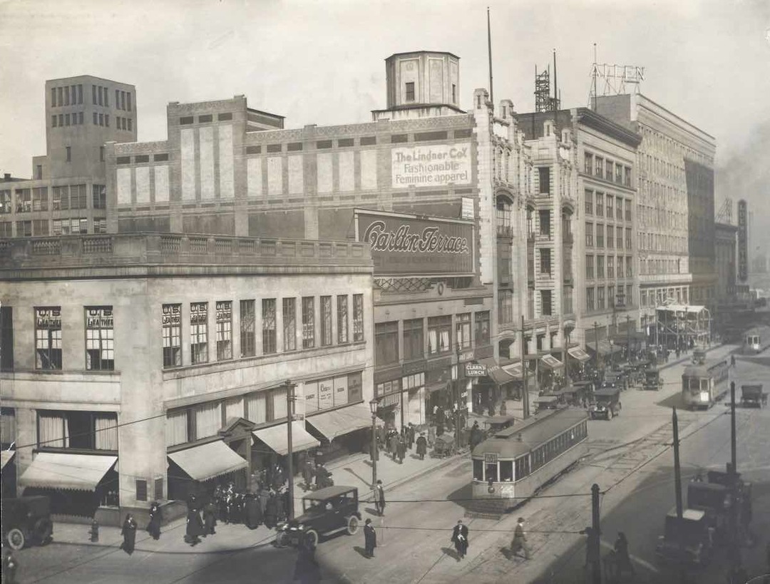 Kinney & Levan from the Southeast This illustration from Souvenir of Cleveland (1921) shows the view one would have had from across Euclid Avenue in front of the Hanna Building. This stretch of Euclid was in the process of rapidly transforming from Millionaires' Row to Playhouse Square. The building to the left, completed in 1915, housed the Lindner Co., a women's store that through later mergers became the Sterling-Lindner department store. Source: Cleveland Public Library Date: 1921