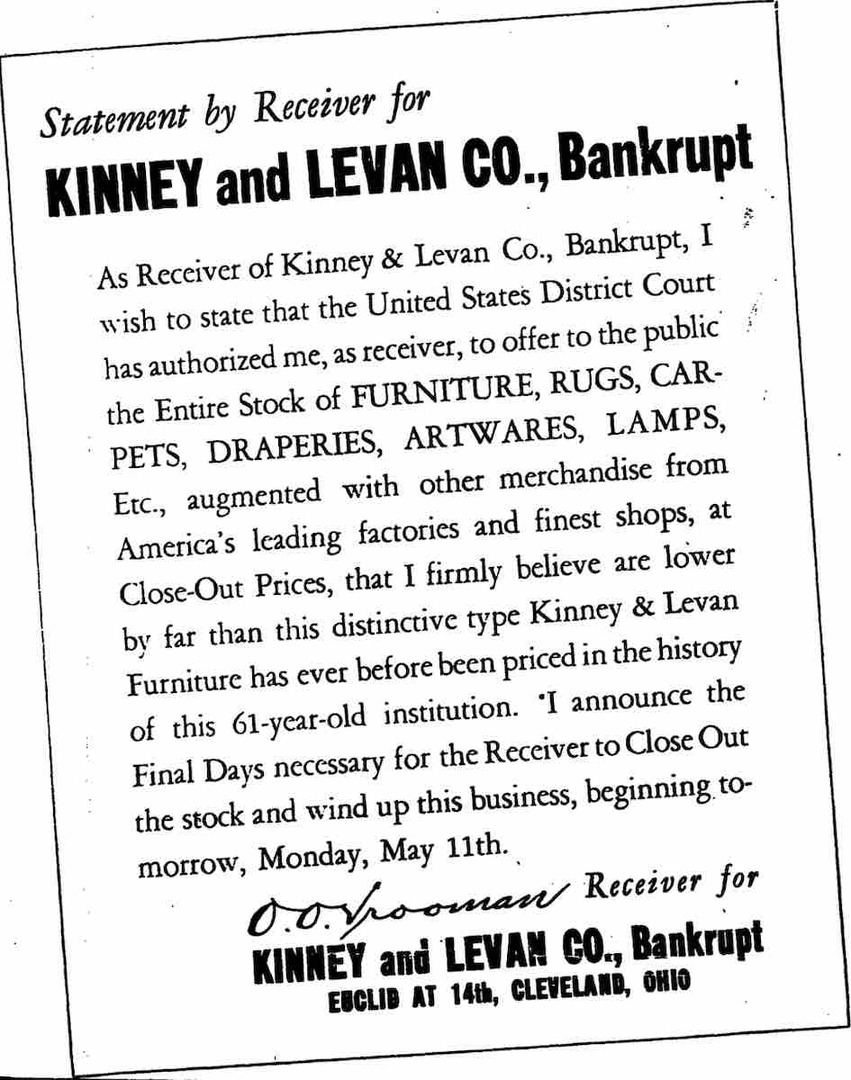 Bankruptcy Notice This statement from the receiver appointed by the court to administer Kinney & Levan in its bankruptcy points to the unprecedented bargains that awaited customers in these final days of the store's existence. Source: Cleveland Plain Dealer Date: May 10, 1936
