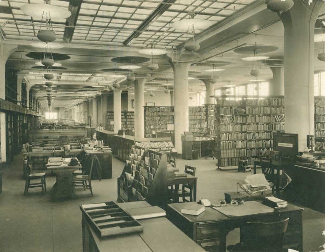 Cleveland Public Library in the Kinney & Levan Building This interior view on the sixth floor shows the skylight and magazine rack. Source: Cleveland Public Library, Photograph Collection Date: ca. 1915