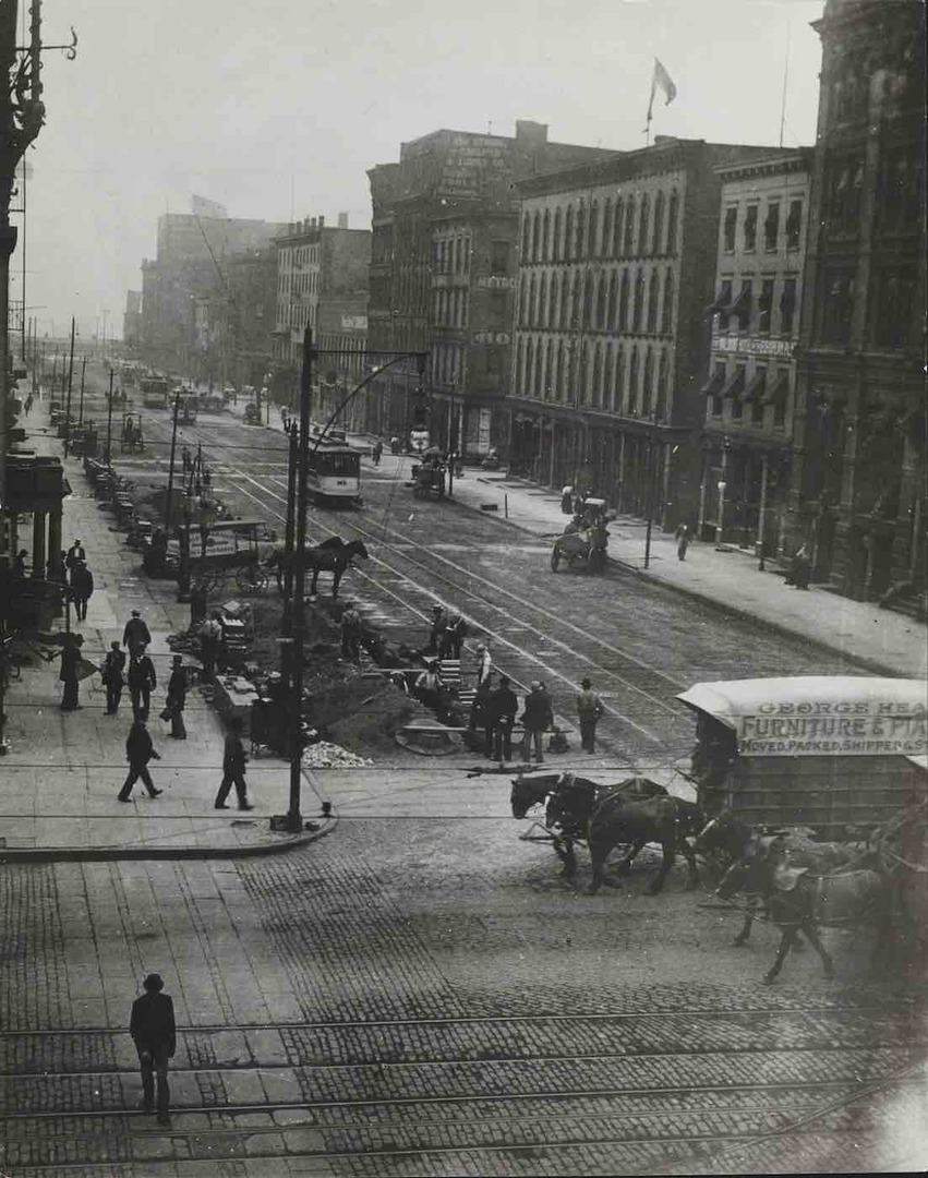 Kinney & Levan's Second Location Kinney & Levan moved from 120 W. Superior to the former Morgan & Root Building (third building from right) at 219-221 Bank Street in 1885. The store remained there until its move to Euclid Avenue in 1913. After 1906, the Bank Street address changed to 1427-37 W. 6th Street. Source: Cleveland Public Library, Photograph Collection Date: 1896