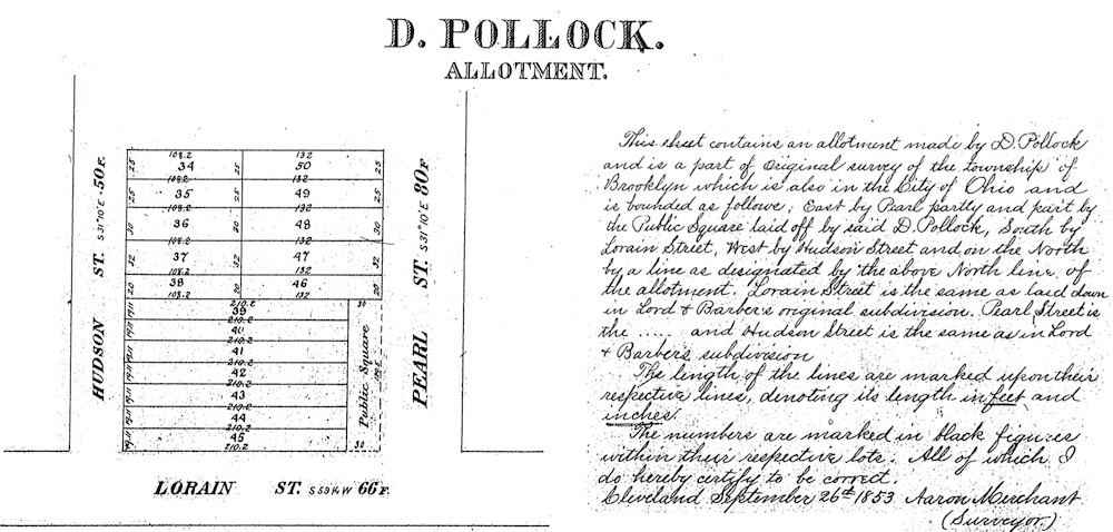 It was in about 1822 that Josiah Barber and Richard Lord, brothers-in-law and pioneer real estate developers, laid out a village west of the Cuyahoga River that they named Brooklyn. This village extended from Detroit Avenue on the north to Walworth Run on the south, and from the Cuyahoga River as far west as today's West 44th Street. On the northwest corner of the intersection of Pearl (today, West 25th) and Lorain Streets, the two men directed their surveyor, Edwin Foote, to set aside a parcel of land, eight rods by eight rods (132 feet by 132 feet), which they made the village's public square.