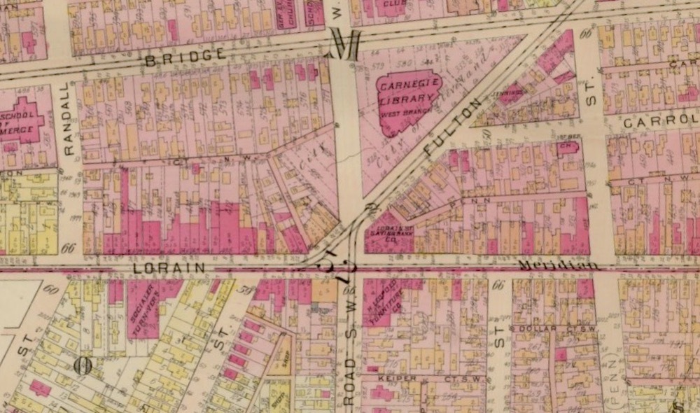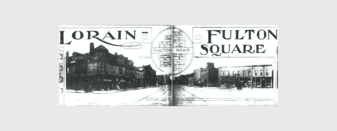 Fulton Road is one of seven streets that were originally designed to radiate from Franklin Circle in accordance with the 1836 subdivision plat created by Ohio City pioneer real estate developers Josiah Barber and Richard Lord. Starting at the Circle, it runs for one-half mile in a southwesterly direction, intersecting several grid streets at sharp angles, before terminating--at least until 1905--at Lorain Avenue (then, Lorain Street). It is unknown whether Barber or Lord envisioned it, but the original terminus of Fulton Road was destined to become one of the most commercially important corners on the west side of Cleveland in the late nineteenth and early twentieth centuries.