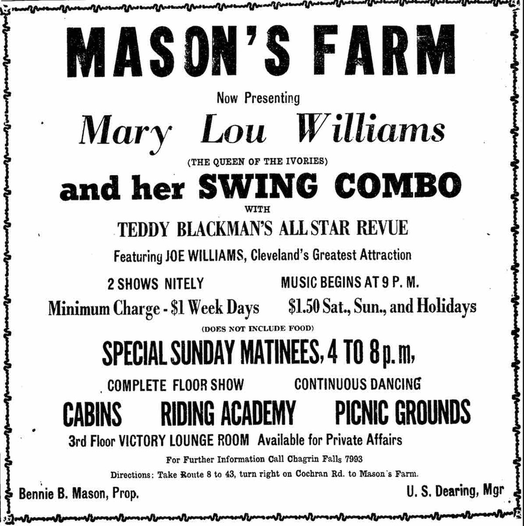 In 1935, Benjamin “Benny” Mason purchased a 160-acre farm in Solon on Cochran Road south of Route 43 and established what became known as “Mason’s Farm,” a popular resort, country club, and jazz venue. A well-known game operator, Mason purchased the farm and the Cedar Country Club subsequently opened in 1936. Upon the farm’s opening, Mason remarked, “I want to do something for my people. I want to make this farm a place where they can relax and enjoy themselves. I want to provide a place for them comparable to other races.” Despite its rural location beyond the east suburbs of Cleveland, one of the features Mason boasted was the Cedar Country Club's proximity to the city itself, claiming only a twenty-five-minute drive from Carnegie and East 55th Street in Cleveland. With the accessibility of the resort, both in location and its integrated clientele, the farm quickly became a popular destination for visitors across the country as well as Clevelanders. The Cedar Country Club gained national acclaim as the “showplace of Ohio.” The resort included furnished cabins, a restaurant, and nightclub. Some of its features included a riding academy, picnic grounds, and occasionally tours of the farm for students.