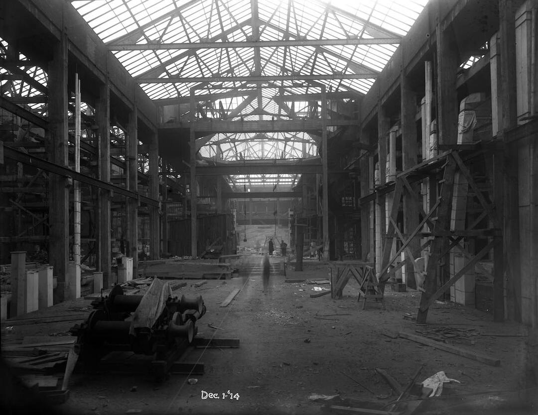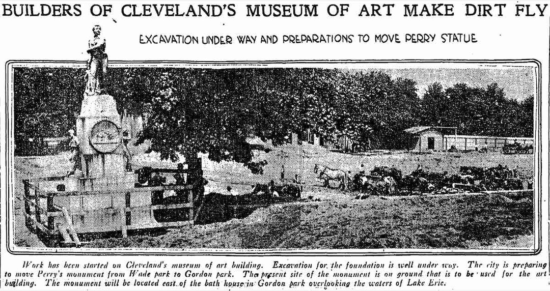 The headline “First Stake Driven for Art Museum” introduced surveying action that occurred on the property in 1911 and Hubbell’s promise that the building would be completed in two years. Despite his claim of such a short build time, more challenges appeared. Even with the Huntington and Kelley Trusts taking on the cost, they were over their $1 million budget. The original plans centered around the three trusts were now questioned. The design committee went over a variety of new plans presented by Hubbell including new one-story options to help save money. Ultimately, they chose to go with a two-story option that gives the look of a single story from the north but presents a grander facade when viewed from across Wade Lagoon to the south. The design, rendered in white Georgian marble, reflected the Beaux-Arts influence that accompanied the pervasive City Beautiful movement of the time. In the fall of 1912, with little progress made, the Trustees blamed the architects for the delay of the museum. In the meantime, roads around the planned museum location were being constructed and by 1913 excavation was under way to move the Perry Monument from its spot in Wade Park to Gordon Park to make room for the museum. Excavation continued without pause until 1914 when police stopped construction due to missing permits. Along with missing permits, the plans for the building violated state building codes and Hubbell had to adjust the plans again to add more exits and reach code approval. After obtaining the proper permits, construction continued.