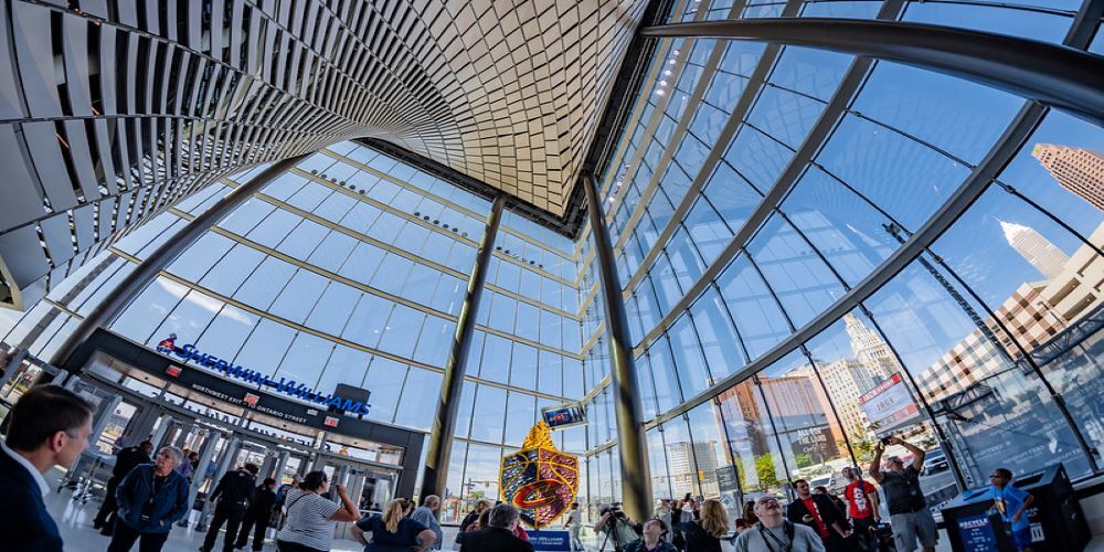 Gund Arena opened on October 17, 1994. After a decade of planning and work, the result was a state-of-the-art sports facility that was "well integrated into the existing fabric of downtown." At the grand opening of the venue, visitors got their first look at the curved roof, glass walls, and large arcades throughout the stadium. The interior of the complex was visible from the outside and featured, "lobbies, a restaurant and sports bar, box offices, stairways and escalators." The architects – from Ellerbe Becket and Robert P. Madison International – succeeded in making the stadium seem open and living in accordance with the rest of downtown Cleveland.